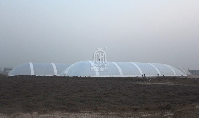 2013年底,3座100米x30米的農(nóng)業(yè)示范充氣膜大棚在山西竣工,圖為充氣膜大棚的效果圖與實(shí)體圖: